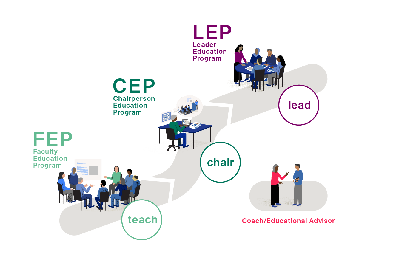 Chairperson Education Program (CEP)The CEP is targeted at experienced faculty members with an upcoming chairperson assignment and prior FEP attendance. The program introduces program planning principles, faculty management, as well as assessment and evaluation.Program duration: 5 weeks online—1.5 days face-to-face—1 week online. |