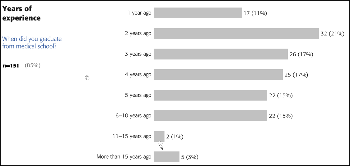 Interpretation: Around 80% of the participants are residents while the remaining have more experience, with 5 individuals being highly experienced surgeons. Since the course content is tailored for junior surgeons, the more experienced surgeons could, for example, lose motivation or dominate the case discussions.