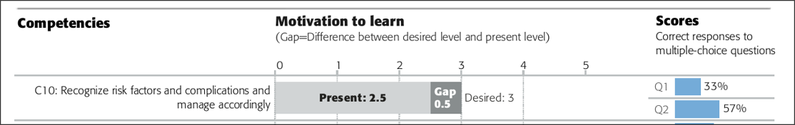 This report is shared before each educational event and serves to help chairpersons and faculty adapt course content to best meet participants’ needs. It is also an educational tool for participants to engage with the learning before the course and to predispose them to learning. For curriculum-based courses, multiple- choice questions for each competency have been created and the results are shown in this report.