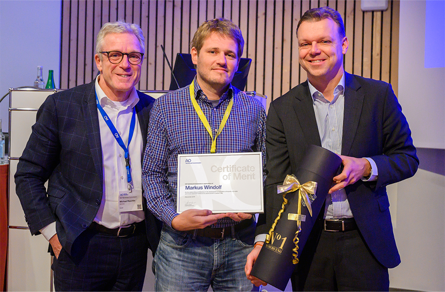 In December 2019, Markus Windolf received the AO Technical Commission Certificate of Merit. He was in particular awarded for the outstanding and innovative development of a simplified navigation system based on shape recognition and for a concept to automatically determine the required screw length during drilling.
