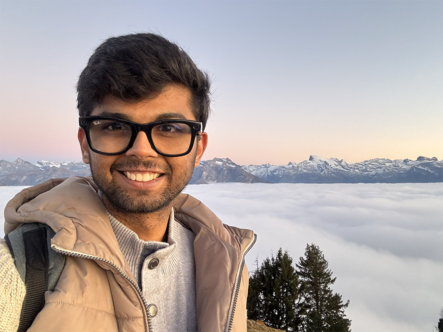 Apoorva Kabra above the clouds with Alpine peaks amidst the majestic Swiss mountain landscape