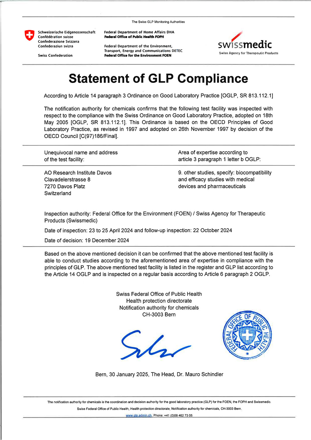 High-quality work is important for successful research. AO Research Institute Davos works hard to ensure the highest quality in all our research projects. Therefore, we are very proud to have received the official Statement of GLP Compliance from the Federal Office of Public Health, of the Swiss Confederation through Swissmedic (Swiss Agency for Therapeutic products), together representing the Swiss GLP monitoring authorities, in October 2018. AO Research Institute Davos is one of only two academic institutes certified for GLP in Switzerland.