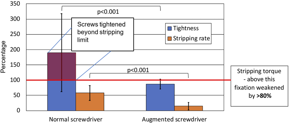 With a normal screwdriver, stripping rates were high, though varied greatly amongst surgeons. Using an augmented screwdriver greatly improved insertion, with optimum tightness being achieved alongside with a significantly reduced rate of bone stripping.