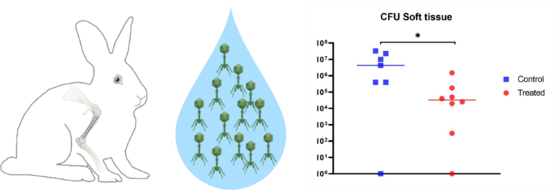 In a rabbit humerus osteotomy and LCP fixation model with S. aureus inoculation, the phage-loaded hydrogel was pipetted onto the LCP. After surgery, the animals were observed for one week after which they were euthanized. In the soft tissue, there was a significant decrease in bacterial load in the animals that received the phage-loaded hydrogel (Figure).