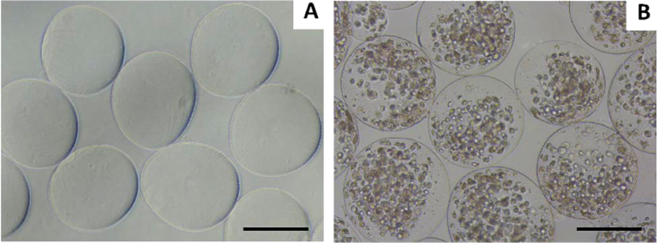 In this project, we optimized the production of electrosprayed human bone marrow stromal cell (hBMSCs)–embedded alginate–gelatin (Alg-Gel,) microspheres for the purpose of their assembly in a 3D-printed poly(ε-caprolactone) (PCL) scaffold for the fabrication of a mechanically stable and biological supportive tissue engineering cartilage construct. Optimization of hBMSC-embedded Alg-Gel microspheres produced by electrospray has been performed (Figure). The Alg-Gel composition selected allowed the conservation of hBMSC viability and supports proliferation and matrix deposition. The possibility to seed and assemble microspheres in designed 3D-printed PCL scaffolds for the fabrication of a mechanically stable and biological supportive tissue engineering cartilage construct was demonstrated. We optimize and demonstrate that electrospray microsphere fabrication is a cytocompatible and facile process to produce the hBMSC-embedded microsize tissue-like particles that can easily be assembled into a stable construct. This finding could have application in the development of mechanically competent stem cell–based tissue engineering of cartilage regeneration.
