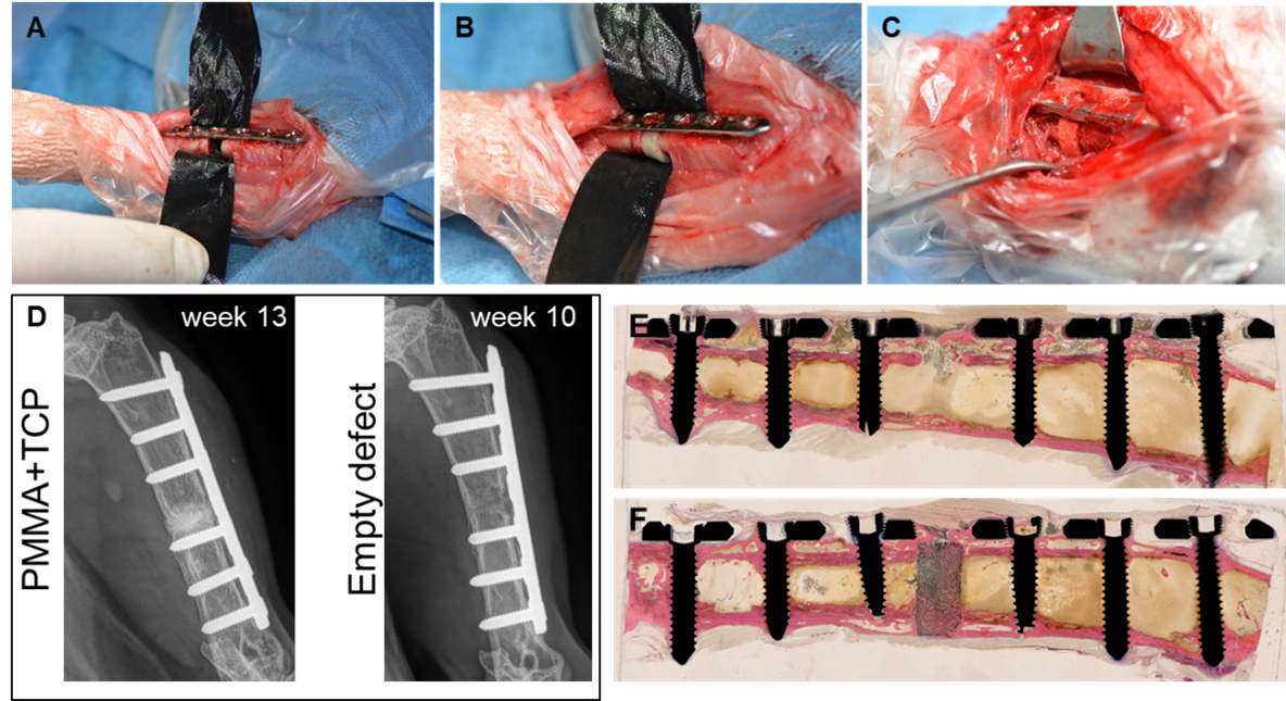 he first step was to transform our well-established model of humeral osteotomy in rabbits into a 5 mm defect model. The defect was filled with a PMMA spacer (Figure) to induce a membrane. After three weeks, the PMMA spacer was removed and exchanged for either a bone void filler (Tricalciumphosphate, TCP) or the defect was left empty. In total 11 rabbits were operated successfully suggesting the model is functional and bone healing is ongoing in the defect-filled group as well as in the empty defect group. In 2020 and 2021, the model has been modified to introduce the local infection and analyses of the histological results is ongoing.