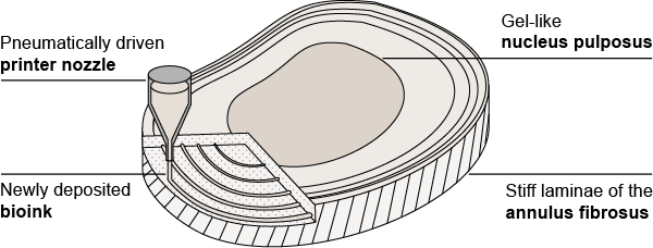 The aim of the INDEED project is to address these shortcomings by developing a reproducible 3D bioprinted IVD model, composed of materials natively present in our bodies, and with similar mechanical properties. To that end, we are utilizing our combined expertise on disc biology and materials science to develop composite bioinks which allow independent tuning of extrusion and post-printing properties. We employ computational approaches to optimize both the bioprinting process and disc design. We believe that by allowing us to independently vary each of its parameters, this model will be of great interest in furthering our understanding of disc degeneration. Additionally, this project will contribute developing 3D bioprinting technologies to engineer human tissues.