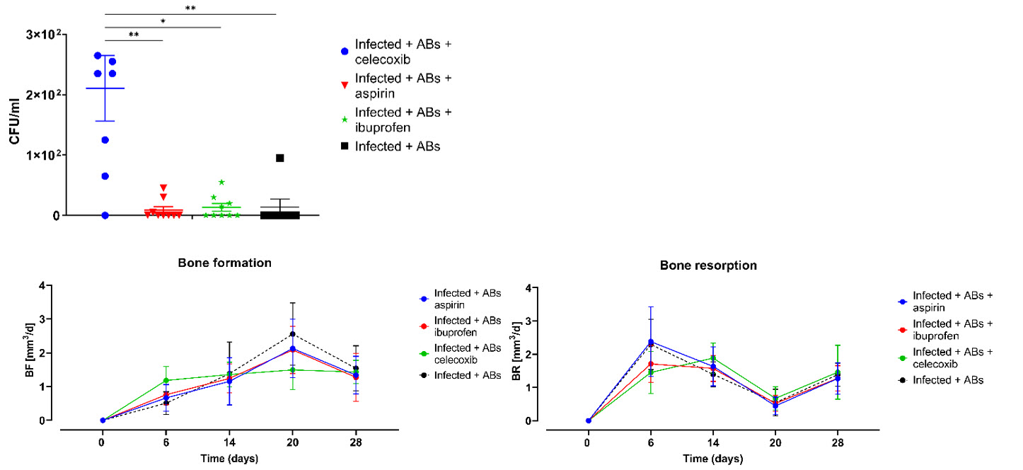 Celecoxib (COX2 inhibitor) in combination with antibiotics showed a negative effect in clearing the infection. Despite this negative effect, celecoxib treatment showed a higher bone formation and a lower bone resorption in the early stage of the infection. Further investigations are ongoing to evaluate whether a short NSAID treatment shows better outcome compared to a long NDAIS treatment.