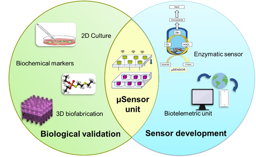 Despite the growing demand and interest in biofabrication in the field of tissue engineering and regenerative medicine, there are currently no efficient methods for monitoring construct function and behavior over time. In collaboration with CSEM (Landquart) we aim to create an innovative method based on insertable micro-biosensors that can screen in real time and non-invasively cellular behavior during the (bio)fabrication and in vitro maturation process. We will develop a device with miniaturized sensors that can measure parameters and send the information to a remote controller. The monitoring will aim at quality control (viability, differentiation), to increase the success rate for therapeutic transplantation. Nowadays the most common analysis techniques include the sampling of medium and measurement of analytes by spectrophotometric assays, HPLC or gene expression analysis. These methods do not allow us to follow the cellular quality in real time and remotely. We aim to create an innovative and non-invasive way to study the behavior of cells with ad hoc insertable specific miniaturized micro-biosensors that allow in situ and real-time quality control of tissue engineering constructs. The monitoring will be done on a cellular level on multiple samples (inside tissue culture plates) over culture time by an easy, cost-effective, analytic, and reproducible method using specific markers based on the desired type of observation.