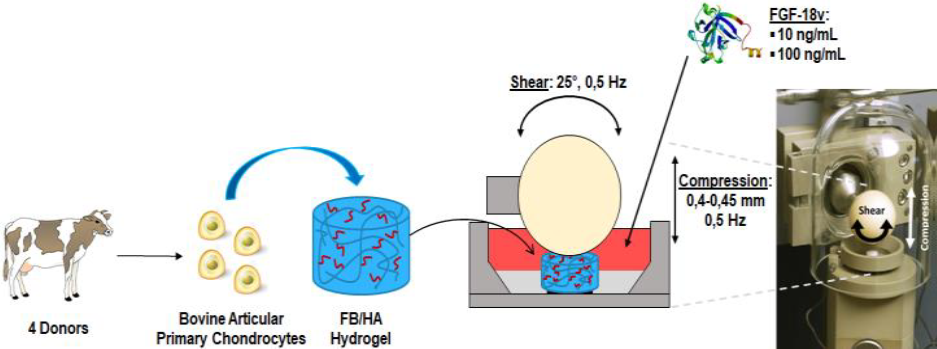 A collaborative study aimed to test the interplay between mechanical and fibroblast growth factor (FGF)-18 mediated biochemical signals on the proliferation and differentiation of primary bovine articular chondrocytes embedded in a chondro-conductive Fibrin-Hyaluronan (FB/HA) based hydrogel. Chondrocytes seeded in a FB/HA hydrogel, with or without a chondro-inductive FGF18 variant were loaded within ARI's joint-mimicking bioreactor applying controlled, multi-axial movements, simulating the natural movements of articular joints.