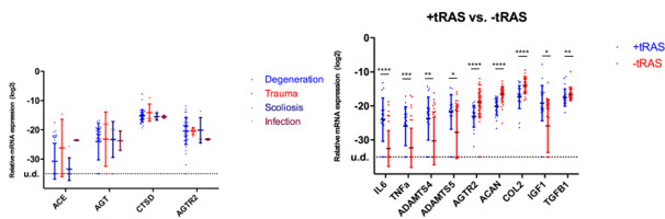Gene expression of tRAS components such as angiotensin-converting-enzyme (ACE), Ang II receptor type 2 (AGTR2), angiotensinogen (AGT), and cathepsin D (CTSD) was confirmed in human IVDs (Figure 11.9.7 left). IVD samples that expressed tRAS components (n=21) revealed significantly higher expression levels of interleukin 6 (IL-6), tumour necrosis factor α (TNF-α), a disintegrin and metalloproteinase with thrombospondin motifs (ADAMTS) 4 and 5 compared to tRAS-negative samples (n=37) (Figure 11.9.7 right). Furthermore, within tRAS-positive samples, AGT, Matrix-Metalloproteinases 13 and 3, IL-1, IL-6, and IL-8 were expressed significantly more highly in traumatic compared to degenerated IVDs. Biochemical analysis of IVD tissue revealed significantly higher total GAG/DNA content of non-tRAS expressing IVD tissue compared to tRAS positive tissue. Immunohistochemistry confirmed the presence of AngII in the human IVD. This study identified the existence of tRAS in the human IVD and suggests a correlation between tRAS expression, inflammation, and ultimately IVD degeneration.