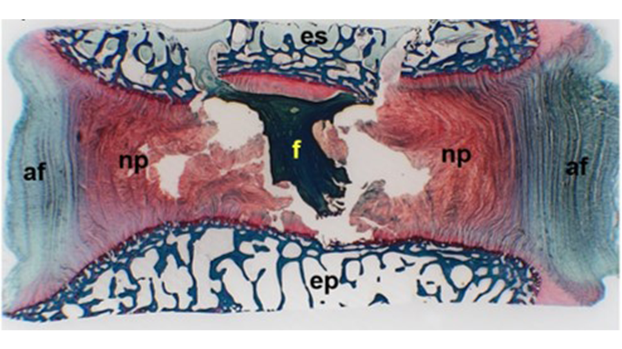 Histological section of bovine intervertebral disc with fibrin based implant (af: annulus fibrosus; np: nucleus pulposus; f: fibrin).
