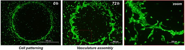 3D SIM technology resolves an array of challenges—difficulties in rapid and mild recreation of the natural complex morphology of tissues and organs during surgery—presented by other promising tissue engineering technologies, such as 3D printing. In less than a minute, the system generates large-size, cell-patterned constructs (from a few millimeters to 150 square centimeters) to guide the formation of vascularized tissues—a real breakthrough. The technology can pattern cells and build tissue layer upon layer, meaning that it can be used to generate specially orchestrated tissue models for use in screening drugs, creating patient-specific tissue or disease models.