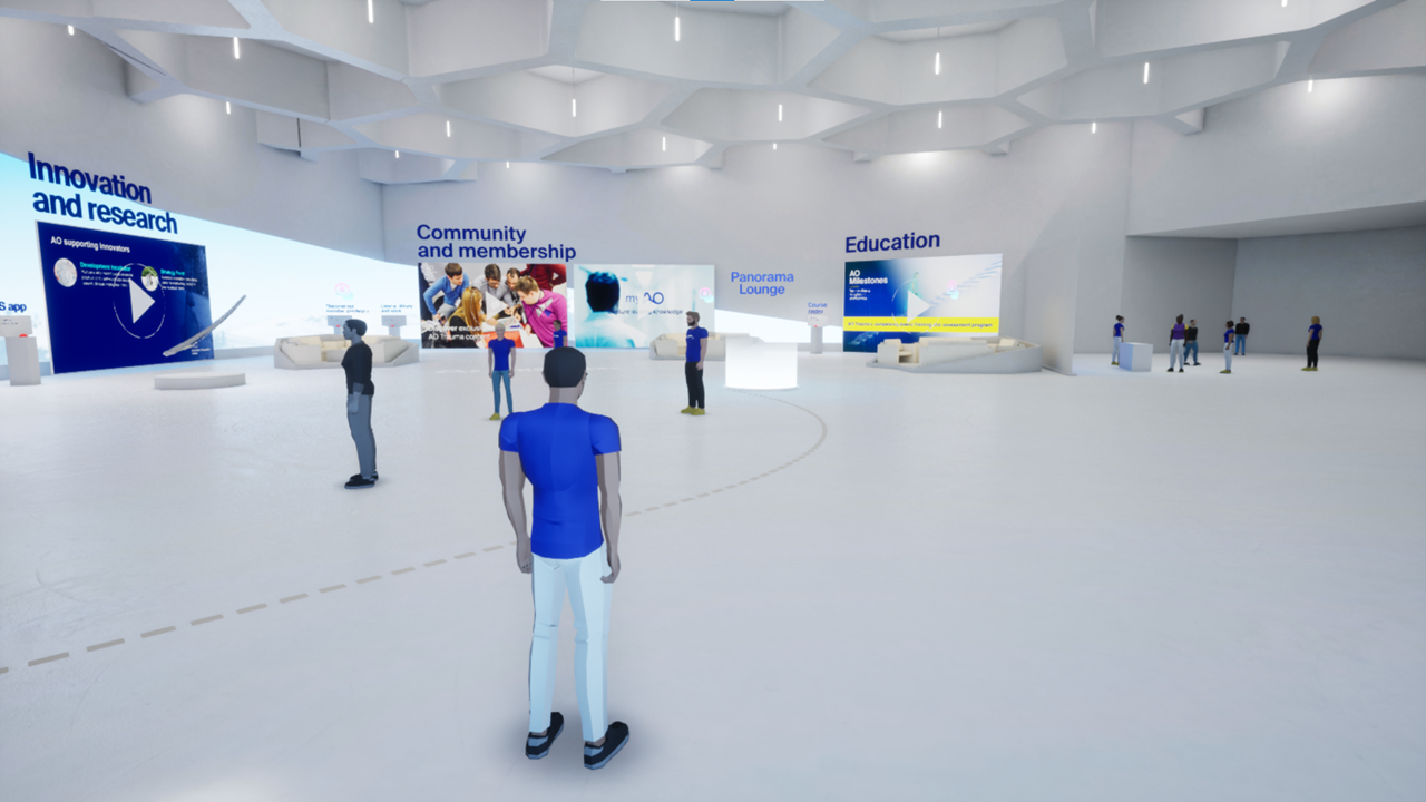 The virtual environment, designed to facilitate synchronous communication between users, took the participants on a virtual gondola over snowy Davos through a historical background of the AO, towards the virtual Davos Congress Centre, entering through the Davos Foyer (including AO and partner booths) where participants’ personalized avatars got the latest on innovation and research activities at the AO, as well as networked with peers. Here they also enjoyed sessions from the Shard's 360° view wetlab which gives a front-seat view of live surgery as if you were there in person.
