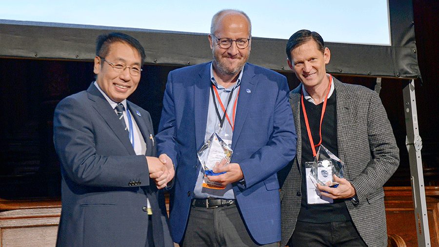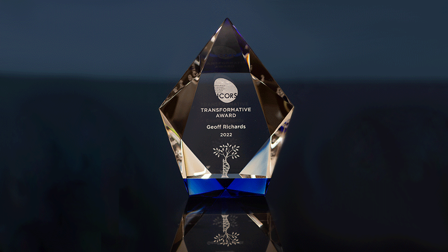 Prof Geoff Richards (left) and Dr Theodore Miclau (right) after receiving the ICORS Transformative Contribution Award at the ICORS World Orthopaedic Research Congress, September 8, 2022