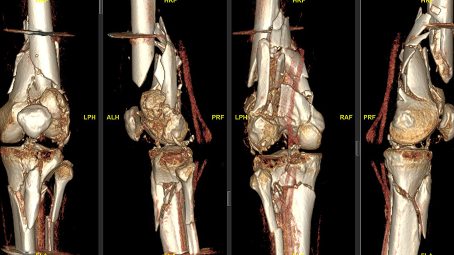 “The patient was driving a car while on holidays in Mexico and was hit from the left side. He had serial rib fractures, a nasty, open fracture of his left elbow, and an open, complex floating knee injury—a comminuted distal femur fracture—and a proximal tibia fracture on the left side, as well as a proximal tibia fracture on the other side,” Sommer explains, noting that after about two weeks of care in Mexico, the patient was flown back to Switzerland by Rega Swiss Air-Rescue. “He arrived at our hospital with an external fixator on his left knee and elbow, and was in generally good shape. First, my colleague fixed his elbow and right tibia; and, unfortunately, the patient had also an injury to his left radial nerve that had to be reconstructed.”