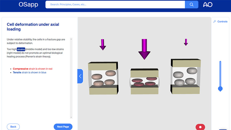 OSapp content is organized as an expanding knowledge hub designed to illustrate and explain the biomechanical principles underlying bone healing and fracture fixation. Interactive virtual models, based on existing and validated biomechanical parameters, facilitate the learning and, importantly, better understanding, of the biomechanical principles, said AO Research Institute Davos (ARI) Biomechanics and Modeling Focus Area Leader Peter Varga, PhD. The development of OSapp continues to be supported by ARI and the AO’s Strategy Fund. The OSapp Medical Advisory Board (MAB) has prioritized collaboration and integration with other highly regarded AO educational fora, including AO Milestones and the AO Education Institute through the Residents Education Task Force, and further evolution of close links with the AO Surgery Reference content.