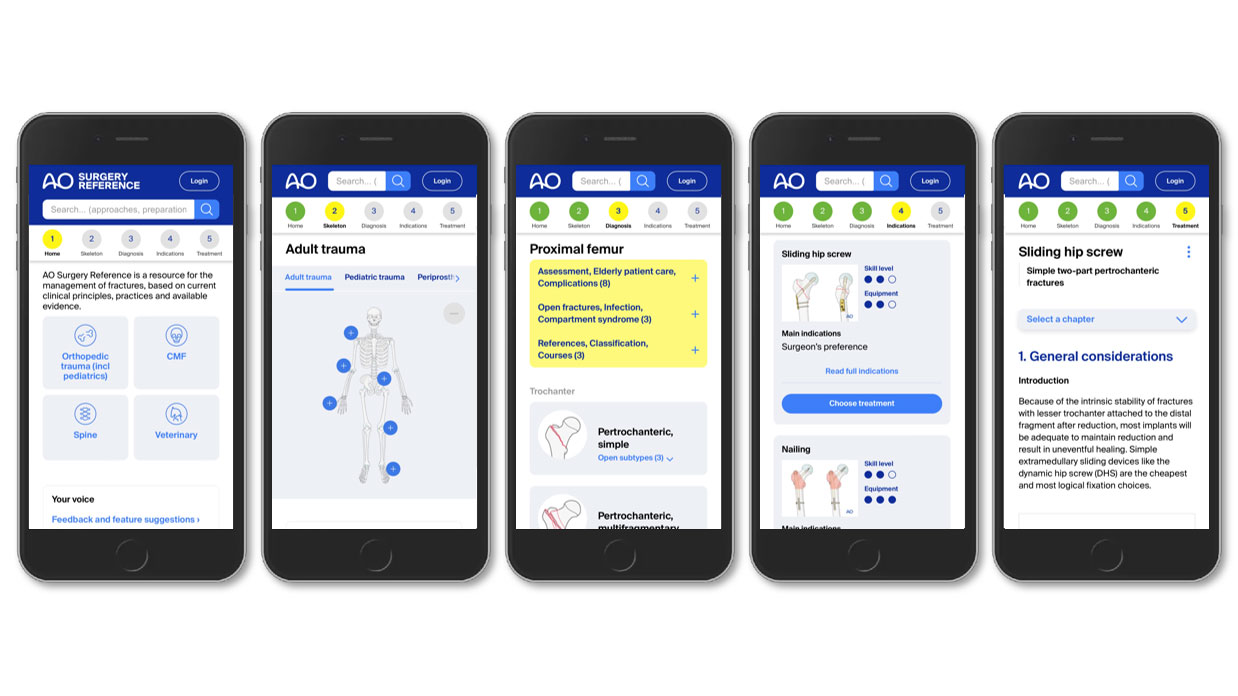 Since its launch, AO SR’s user base has increased significantly, with more than 21 million page views in 2023. Continuous updates, the addition of new modules, and the integration of AO videos support this. The mobile app was developed in 2010, and surgeons now consult AO SR mainly through mobile devices. This means surgeons can access critical information immediately, whether in the operating room, at a seminar, or while preparing for a procedure.