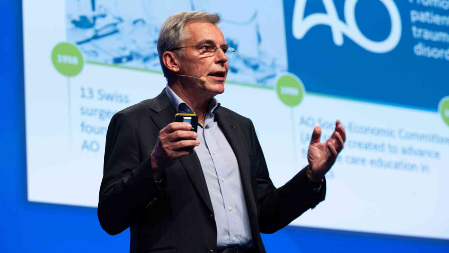 In his keynote address, Pohlemann shared his AO journey—beginning with when he first encountered the AO in 1983 through the AO’s Manual of Internal Fixation (Manuel der Osteosyntheses) when he was a resident preparing for a rotation in trauma surgery. This book, authored by AO founders Maurice Müller, Martin Allgöwer, Robert Schneider, and Hans Willenegger, is internationally known as the go-to book for osteosynthesis specialists. Through this book, Pohlemann learned about the influence of mechanics on biological processes and the art and aesthetics of fracture reconstruction. That was just the beginning of a lifelong relationship with the AO for Pohlemann, who took advantage of the AO’s opportunities to grow a network built upon teamwork, friendship, and collaboration, culminating with his current presidency.
