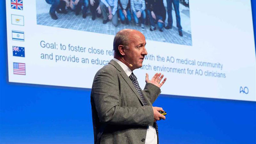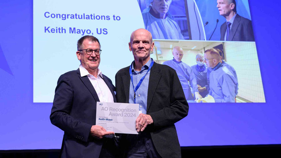 During week one’s Opening Ceremony, Pohlemann presented Keith Mayo with the prestigious AO Recognition Award for his 33-year contribution to the AO’s mission to improve patient outcomes in the treatment of trauma and musculoskeletal disorders through his involvement with the AO Technical Commission and as a medical member of the AO Technical Commission Trauma, as well as the Next Generation Plating Task Force. Pohlemann explained that throughout Mayo’s long and distinguished career with the AO, he has consistently delivered excellence in the development of the pelvic system, as the chairperson leading the Pelvic Expert Group, and as a keynote lecturer at the AO Technical Commission Trauma Experts Symposia and pelvic courses.