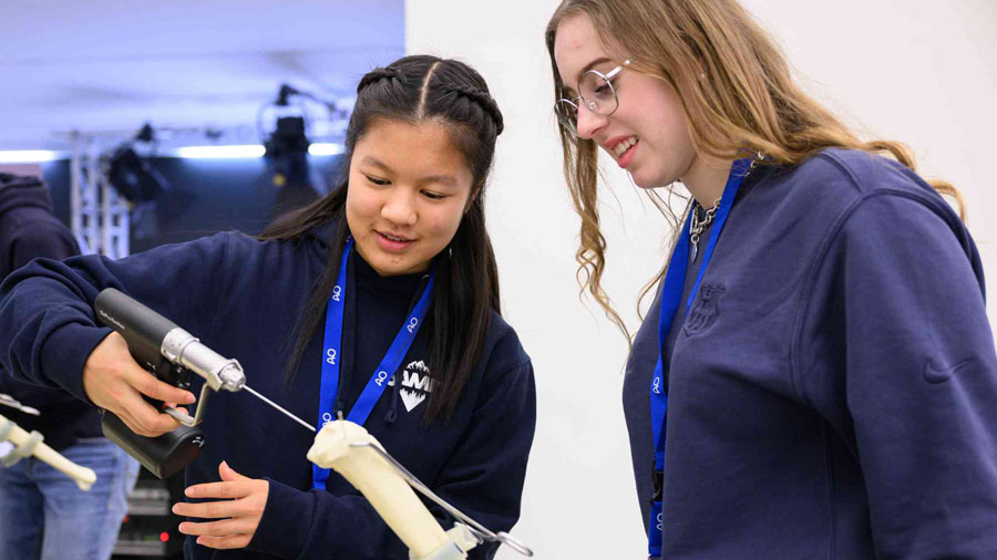 As part of the AO Davos Courses, six students from the Schweizerische Alpine Mittelschule Davos (SAMD) with a focus on Biology had the opportunity to visit the congress center in Davos and treat a tibia fracture on an artificial bone under the guidance of an expert from Spital Davos.