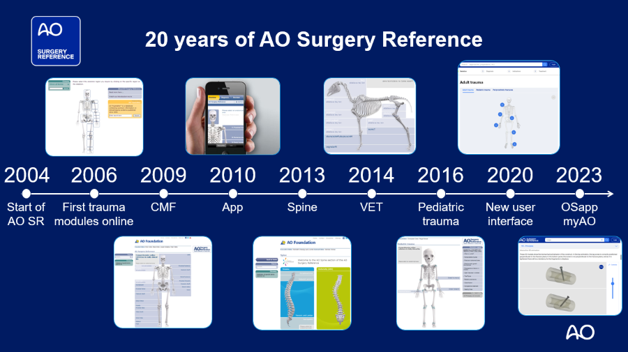 Since its inception in 2004, AO Surgery Reference (AO SR) has become the premier online resource for orthopedic surgeons. With over 800,000 active users annually, it is a comprehensive guide for practicing, teaching, and learning fracture management. Over the past two decades, AO SR has expanded its scope into various specialties, including craniomaxillofacial (CMF), spine, pediatric, and veterinary surgery, solidifying its role as a multidisciplinary resource.